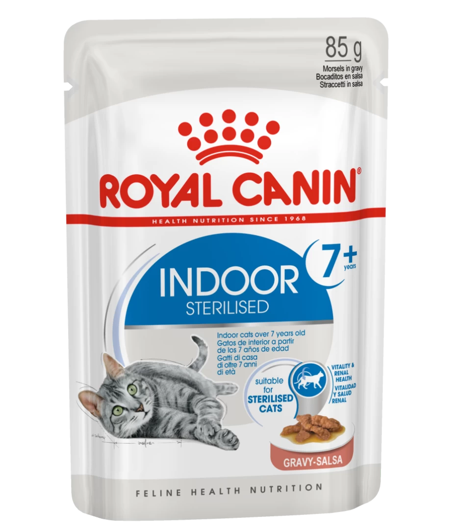 Royal Canin kattenvoer Indoor 7+ in Gravy is speciaal ontwikkeld voor binnenshuis levende katten. Het ondersteunt de vitaliteit van je oudere kat.